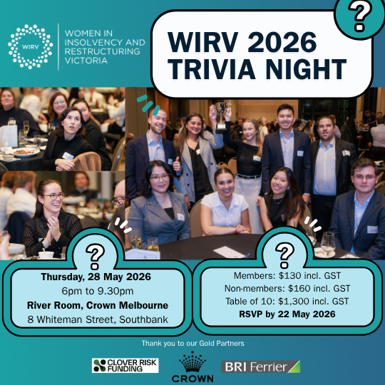 Women in Insolvency and Restructuring Victoria (WIRV), formerly known as IWIRC (Vic), was formed in February 1996 and since then has grown energetically in stature and momentum, boasting on average over 300 financial members.